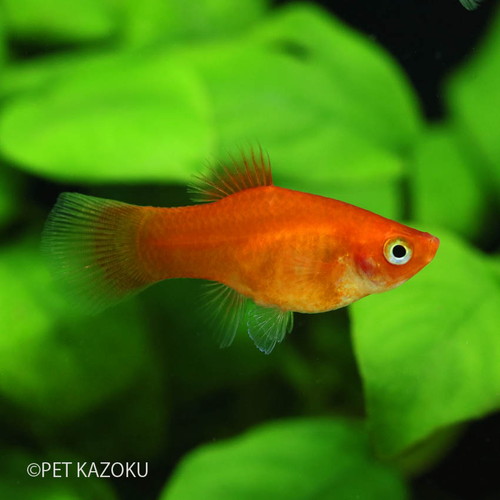 レッドプラティは、その名の通り鮮やかな赤色を全身にまとったプラティの仲間です。水槽に一匹加えるだけで、その華やかな体色が水景全体を明るく彩り、まるで水中に咲く赤い花のようです。光の当たり方によっては、体色がさらに深みを増し、見る角度によって様々な表情を見せてくれます。群れでゆったりと泳ぐ姿は、水槽の主役として、観る人の心を強く惹きつけます。